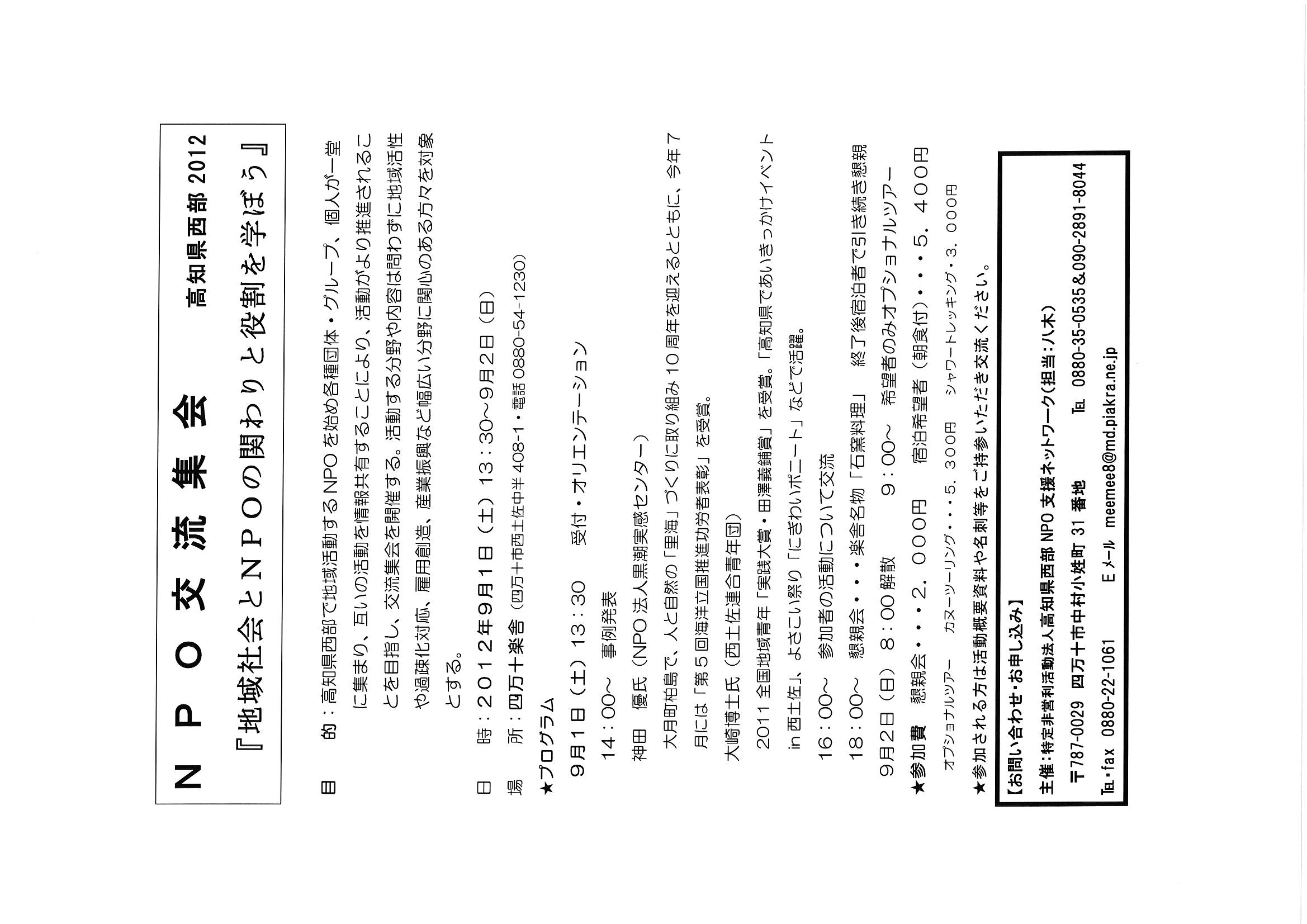 理 事 長 八木 雅昭 くぼかわボランティア連絡協議会 副理事長 大原 泰輔 こうち元気者交流会 理 事 増井 三郎 NPO法人 いきいきみはら会 理 事 山下 慎吾 魚と山の空間生態研究所 理 事 濱田 仁司 へんぜの森 理 事 川村 祐子 中村くらしを見直す会 理 事 畦地 和也 NPO法人 NPO砂浜美術館 理 事 神田 優 NPO法人 黒潮実感センター 理 事 中平 由起子 認知症ネットワークとおわ家族の会 理 事 清家 敬太郎 宿毛元気クラブ 理 事 岡田 充弘 海癒 理 事 宮崎 聖 四万十ガイア自然学校 理 事 西本 五十六 四万十楽舎 監 事 大高 達人 監 事 山本 美佳 NPO法人 ひかりの会 |